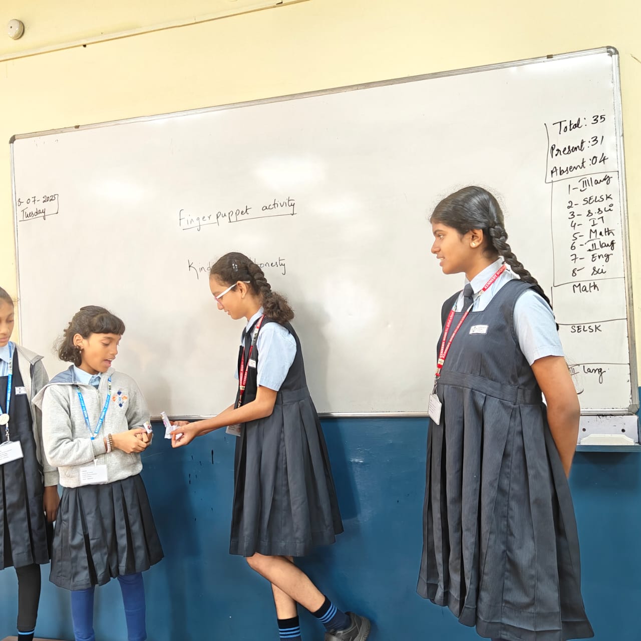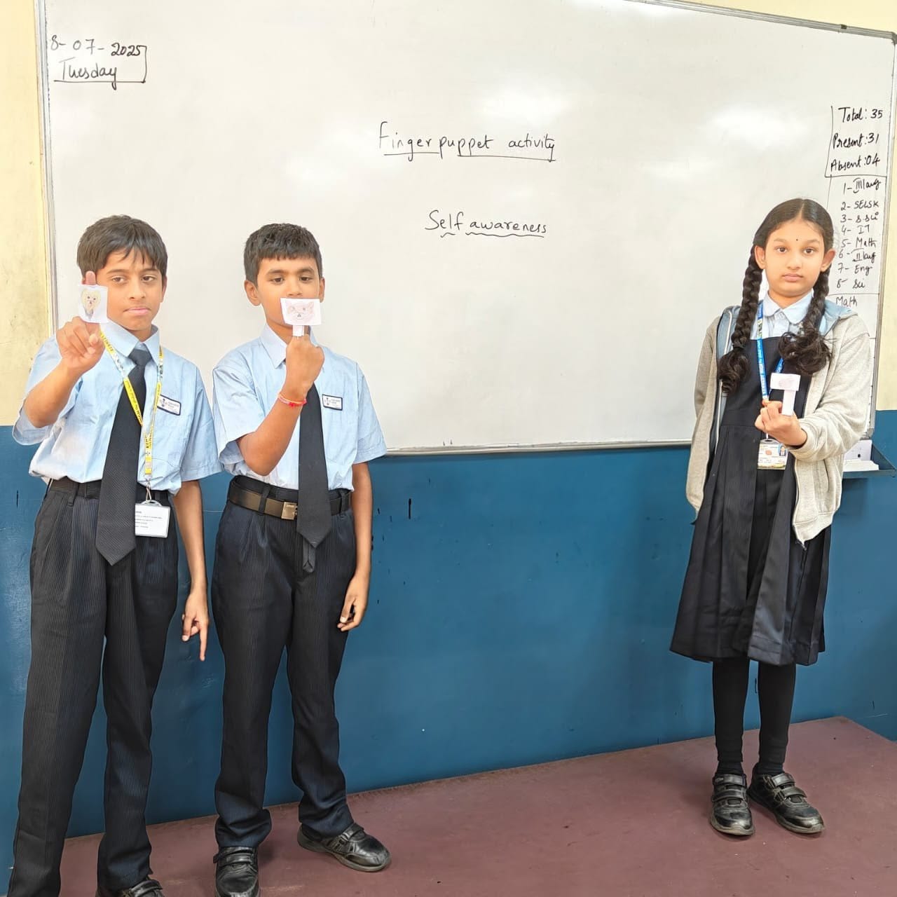 The students used finger puppets to enact a story highlighting kindness, honesty, and sharing. This activity helped them develop their communication skills, empathy, and an understanding of moral values. They also did the art-integrated activity ‘Where do I Feel?’, where they used colours to show where they feel different emotions in their bodies. This encouraged emotional awareness, creativity, and self-expression.