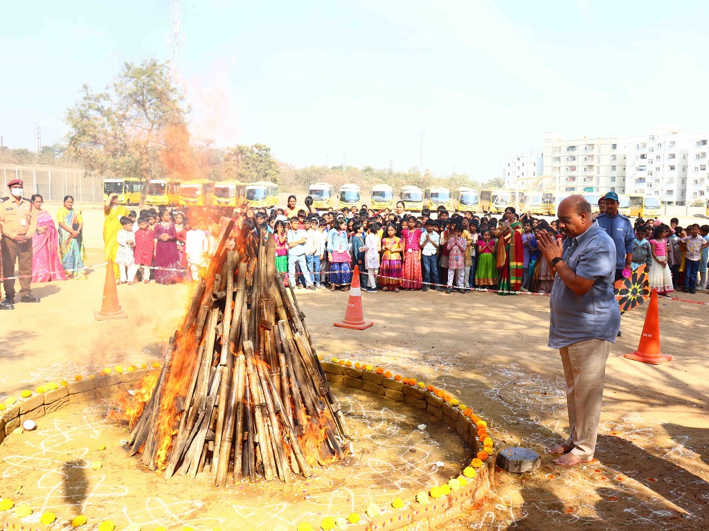 Smt. Rajyalaxmi Bhat inspiring words encouraged students to stay rooted in tradition while confidently embracing the future, reinforcing the values upheld by the institution. The celebrations began on an auspicious note with “Kumba Swagatham”, where students extended a traditional and graceful welcome to the dignitaries. A ceremonial bonfire (Bhogi Mantalu) lit up the surroundings, symbolizing the burning away of the old and the welcoming of new beginnings.