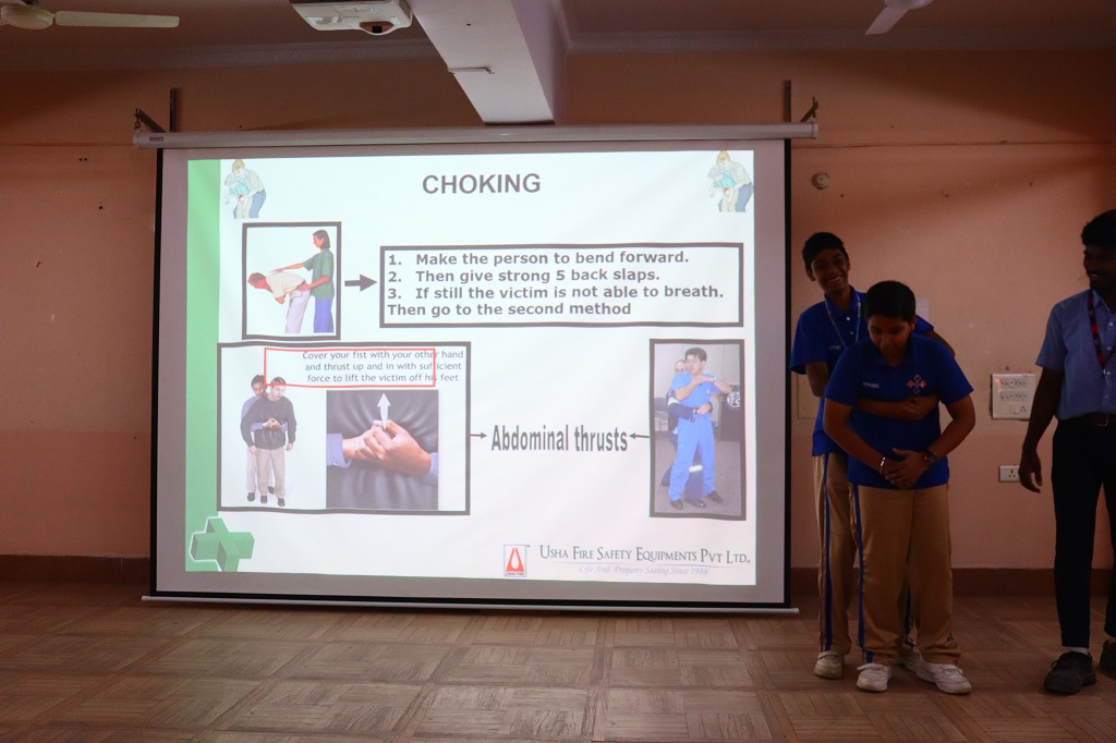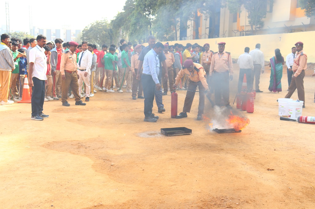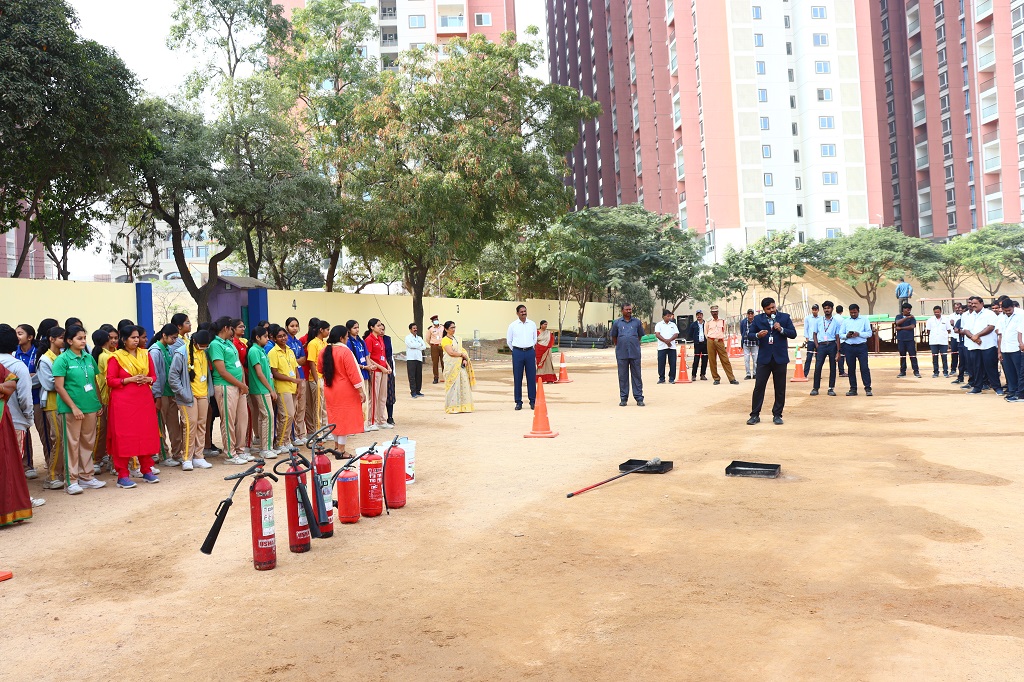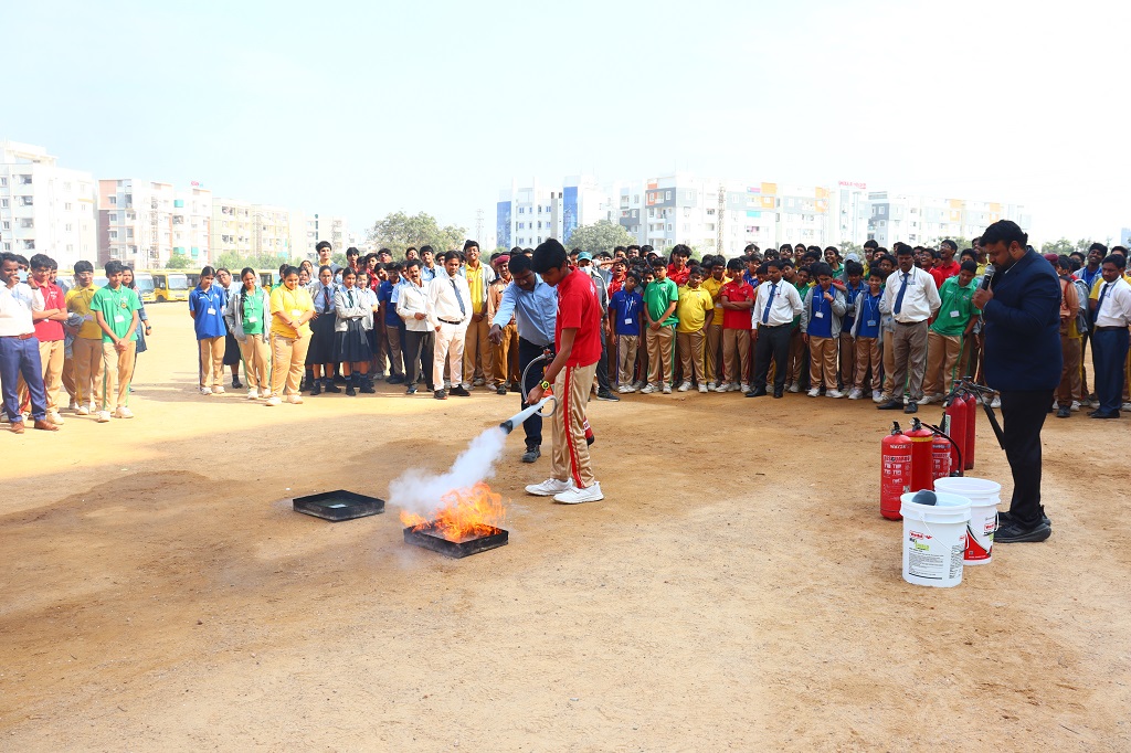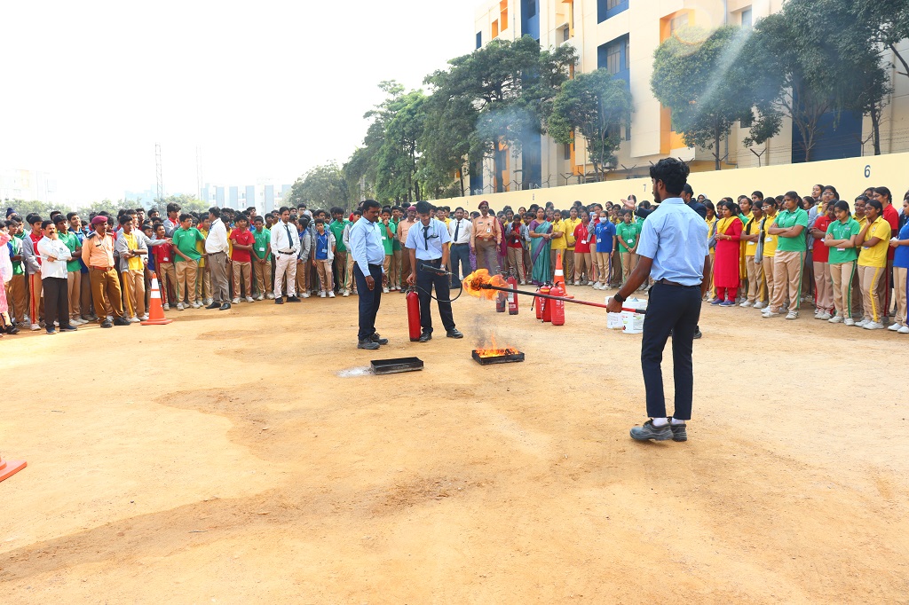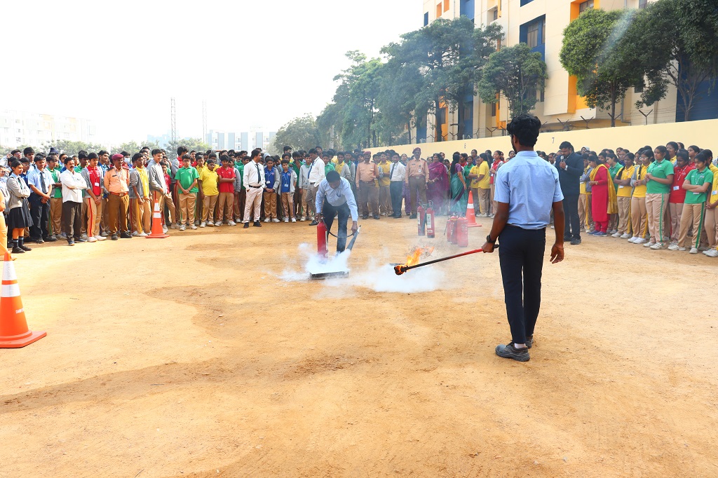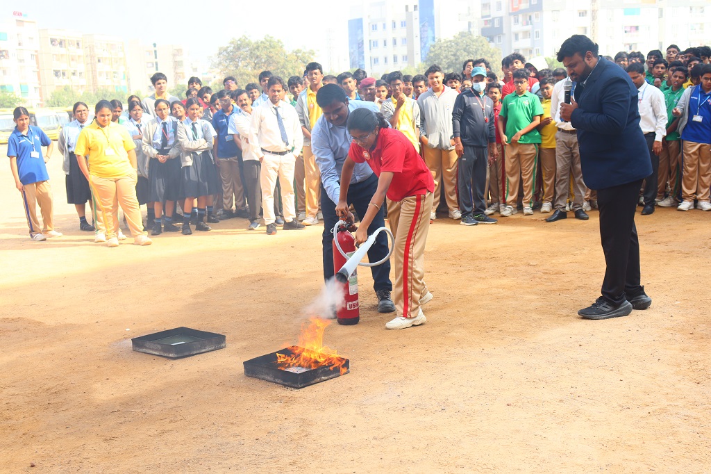 Students of class IX and XI, CBSE and grade 9, Cambridge, participated actively in the mock fire drill which was conducted on Monday, 1 December 2025 by Usha fire agency. Representatives from Usha Fire Safety Works conducted an informative session covering types of fire and appropriate extinguishing methods, demonstration of fire extinguishers (CO2, water, and dry chemical types), correct technique to operate an extinguisher (Pull–Aim–Squeeze–Sweep) and the “Stop, Drop and Roll” method in case of clothes catching fire. A live-fire simulation was shown in a controlled environment to help students understand real-life procedures.